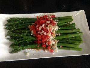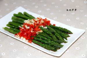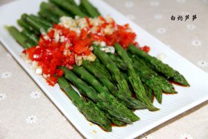 芦笋摆在盘子里,将蒜末和红柿子椒末放在上面,浇上蒸鱼豉油;