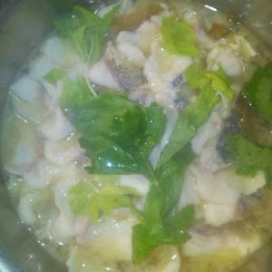 盛入之前捞出鱼骨的盆里,加香葱和芹菜叶(由于我家小孩不怎么吃辣椒,所以就没有放干红辣椒,如果喜欢吃辣,就可以在出锅后把辣椒段加入热油中榨香倒入鱼片上即可)