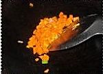 热油锅,放胡萝卜粒进去中火煸炒至变软;
