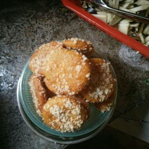 7.压好的豆沙南瓜饼后两面裹上一层面包糠。