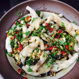 鸡脚从冰水中捞出沥干水分,把调好的料同放入大碗中混合均匀。