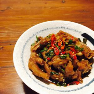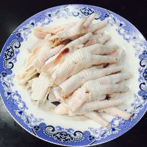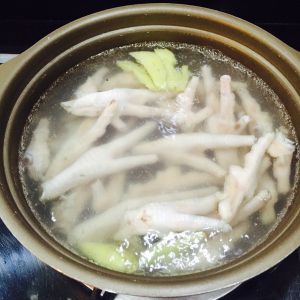 一锅水开后放入姜、料酒,下鸡脚,煮8分钟捞起浸泡在冰水中,以皮肉紧致,口感爽脆。