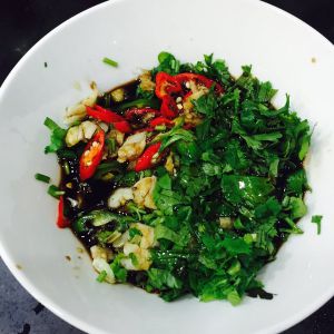 香菜、蒜、小米椒、小青椒通通切碎,放入大碗中,加入酱油、陈醋、鸡精、料酒、芝麻油拌匀,用筷子沾取试味至酸辣适合。