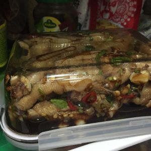拌好的鸡脚装入保鲜盒中置于冰箱冷藏过夜。中途把保鲜盒倒放一次,以便鸡脚完全入味。
