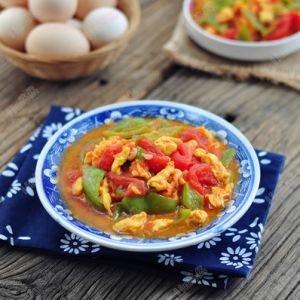 鸡蛋中加入10g水和少量盐,用打蛋器打散,青椒切菱形片,蒜拍碎切末,西红柿冲洗干净切成桔瓣状。