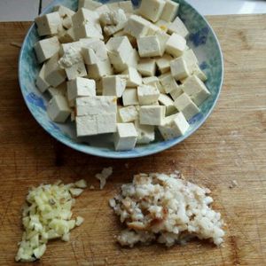 备料如图。豆腐切丁,蒜,肉切沫,花椒粉及花椒