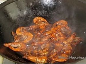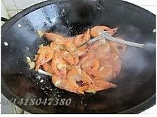 坐锅热油,放姜,蒜,葱白炝锅,虾放入炒至变色,加料酒