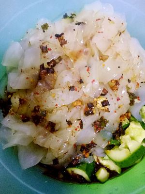 拌好的料汁浇在黄瓜拉皮上,翻拌均匀即可