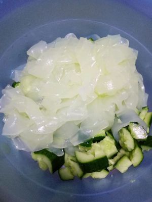 拉皮切条,和黄瓜放在大的容器里(方便调味)