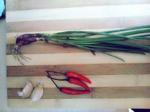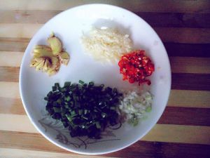 将大蒜、细葱、小米辣切碎。