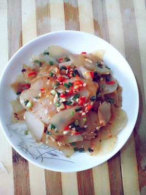 准备两个当季的大土豆,有中性笔那么长!先将切皮的土豆切成薄片,放进锅中煮分钟,然后将煮好的土豆片放近大碗中,放入冷水直至冷却,然后沥干准备凉拌。