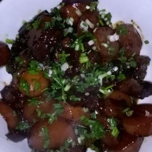 3、锅里放少许油,倒入切好的五花肉,炒出油,加入一半的姜葱蒜,炒出香味,乘出备用!