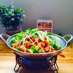 鸡肉均匀的倒入锅仔上面,撒上葱丝,香菜,就完成了。(吃货已经忍不住直接用手抓了,哈哈……)