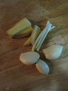 姜切片,葱分葱白、葱绿切,蒜头剥开备用