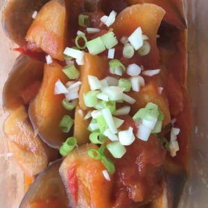 放入茄子,翻炒两分钟,加入适量盐糖生抽