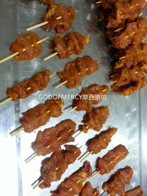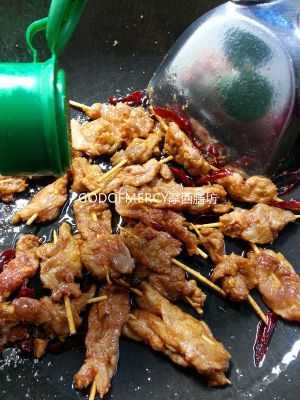 切成3cm长、2cm宽、0.5cm厚的小片;切好的肉块装入碗中,加姜葱汁、放入老抽、嫩肉粉、烤肉料、精盐、花椒粉、辣椒粉、孜然粉等反复捏揉几下,让酱料与肉混合均匀,撒点淀粉拌匀,保持薄薄一层即可。腌制半小时以上。放入冰箱冷藏入味