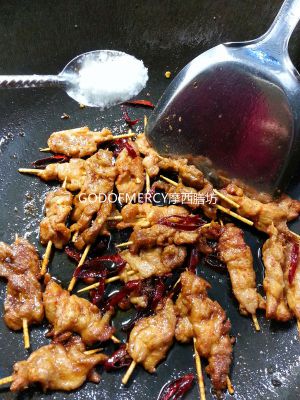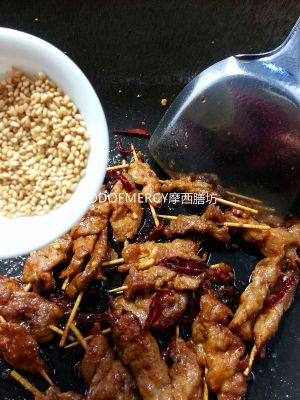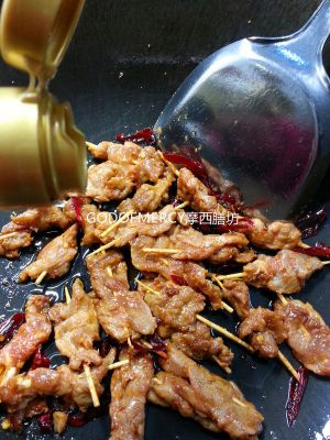 锅中加进少量的油,爆香干辣椒。倒进肉串