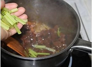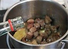 往炒好糖色的牛肉锅里加入姜片,香叶,八角