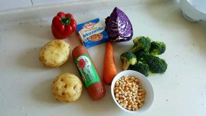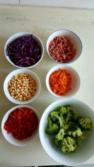 将胡萝卜,红彩椒,火腿切丁,紫甘蓝切长条,西兰花掰成小块,搓玉米粒