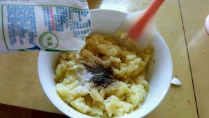 将蒸好的土豆片放入碗中捣碎,在几乎没有大颗粒时加入一小勺黑胡椒,一小勺盐和15ml牛奶(有条件的亲可以将牛奶换成淡奶油再加入一小勺融化的黄油,奶香味更浓哦~)