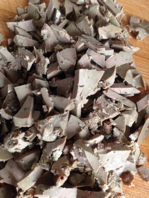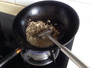 油烧热加入鸭肝碎,同时加入蒜沫翻炒