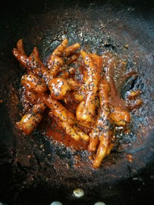 热锅倒油放蒜末,放鸡爪扁香,然后放韩国辣酱,番茄酱,生抽,糖,翻炒一分钟放一小碗水