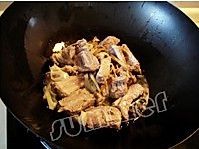 锅中油热后,放入花椒、八角炒香,放入葱姜丝炒香,放入排骨翻炒均匀;