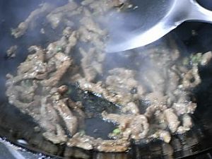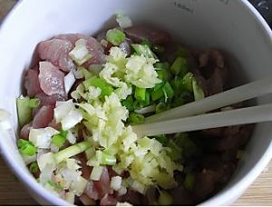 肉丝里加葱姜末生抽料酒一点点油拌匀。