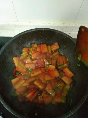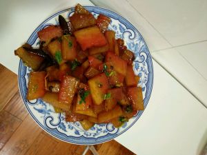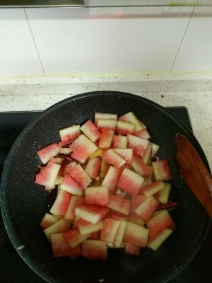 简单的呛锅把切好的西瓜放里面翻炒,盐了,鸡精了,随自己口味放,我没有放糖,然后放少许的老抽,继续爆炒