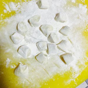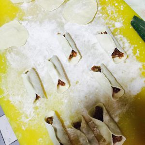 肉馅放在中间,只把饺子皮儿最中间部分捏上即可。