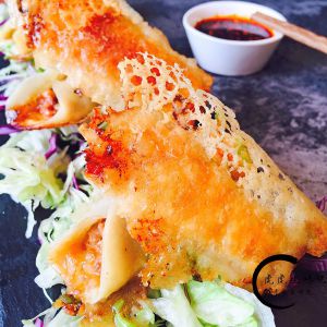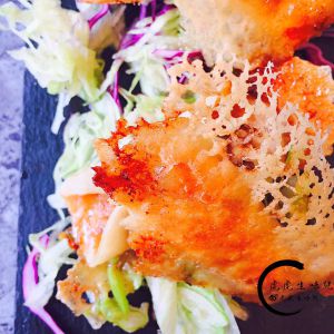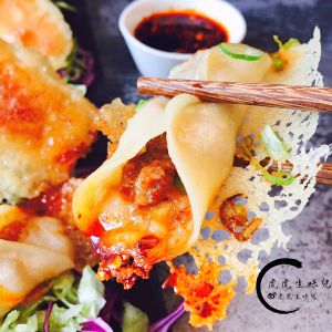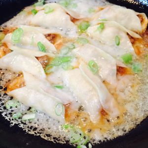 平底锅大火放入油,码好锅贴。这时候需要调一个面糊,就是大概20克面粉加入80克的水搅拌均匀后,倒入锅里。盖上锅盖,闷十分钟。看面糊稍微有点快干,边缘已经有雪花边出现的时候。打开锅盖、小火,在往锅的边缘倒入一些油,知道面糊全部干掉,撒上葱花。关火。