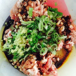 肉馅里加入大葱切末,姜末,生抽,老抽,五香粉,盐,加入少许水打匀。