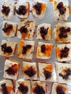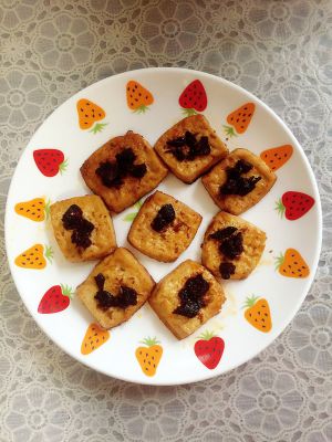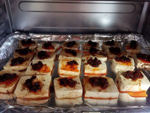 沾好蜜汁的豆腐放在铺好锡纸的烤箱盘中,依次放上提前备好的香菇酱。
