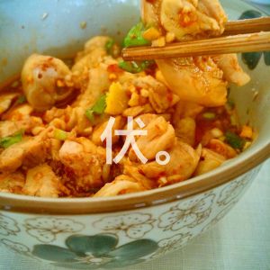取出,取掉牙签,切小块,蒸完后的鸡汁带入调好的汁里