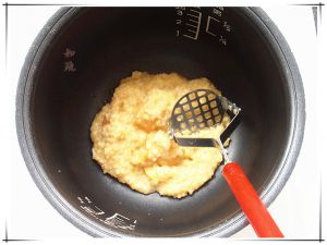 小米和弄成小块的栗子入电饭煲,加250ml清水煮粥档煮软烂;用压泥器、叉子或料理机将煮好的栗子肉弄成小碎粒;