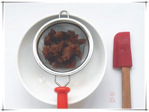 将熟枣肉入茶滤勺用刮板或小勺刮捻,过滤掉枣皮;