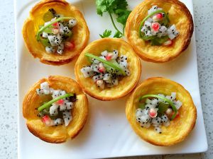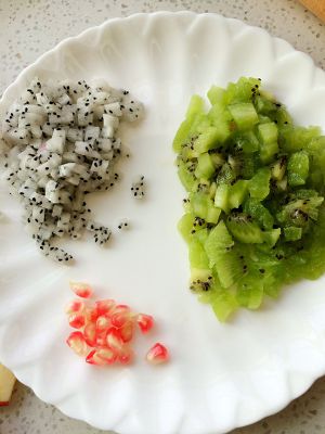 去除模具放入水果丁,香菜去叶子做拱形插上去就可以了!(喜欢巧克力的可以用巧克力做)