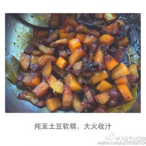 小火焖烧三十分钟,若准备有土豆此时可放进土豆丁,炖至土豆软糯,大火收汁