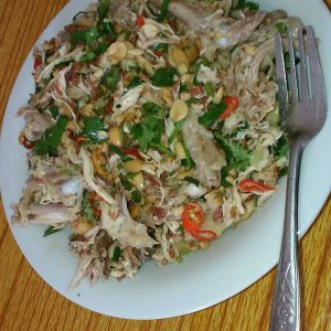 弄完之前的,鸡也蒸熟了。接下来就开始撕鸡。这里要说说撕鸡良器——叉子!!这是绝好的撕鸡武器,不烫手,不脏手,还可以随时尝下味道。刚出锅的鸡肉都可以必撕无疑。前提是,叉子的质量一定要好。撕好了鸡肉,把前面弄的配料一股脑的倒进鸡肉里,拌吧,拌吧,再加点香油(芝麻油)。饿了就开吃吧(゚∀゚)o彡゜