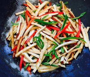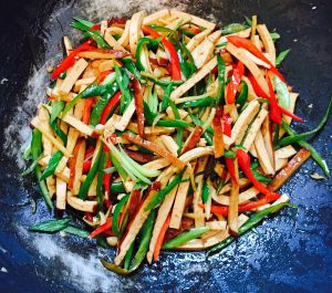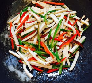 青、红辣椒微炒,倒入沥干水分的豆腐丝,加入适量盐,翻炒均匀。