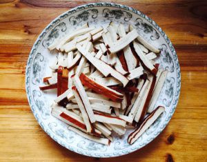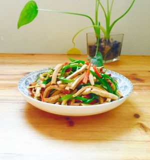 锅里倒入适量清水,倒入豆腐丝,加少许盐,焯水两分钟,捞出沥干水分。(这样豆腐丝炒起来不容易断,口感更好)