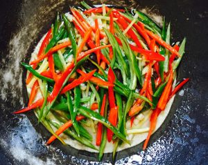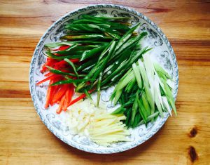 青、红辣椒去籽切成丝,姜切丝,蒜子拍碎,青蒜切斜片。