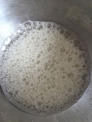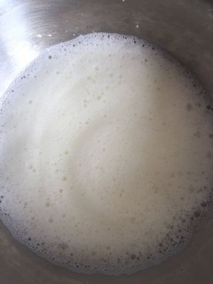 在蛋清中滴入几滴柠檬汁或2g塔塔粉,打蛋器搅拌至图中鱼眼泡状加入1/3砂糖