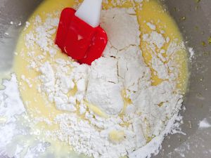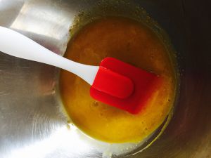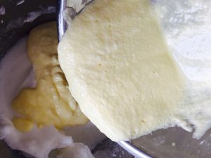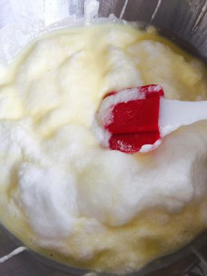 放1/3的打发蛋白到蛋黄糊中,以翻炒手法搅匀