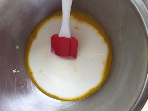 倒酸奶到蛋黄中继续搅拌均匀,手法可模拟炒菜姿势,不可以顺时针方向画圈搅拌