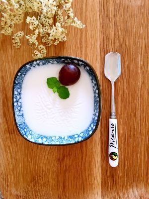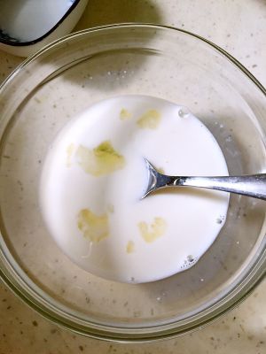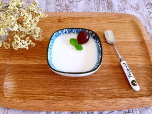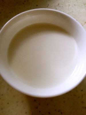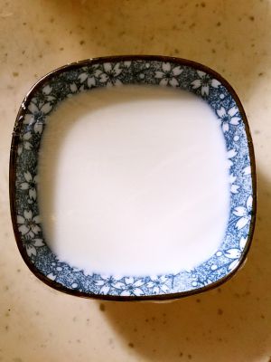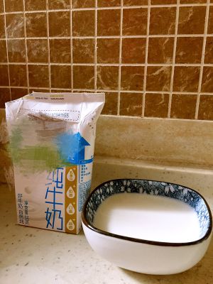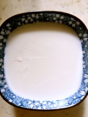 晾凉后的牛奶面上会有一层奶皮,将奶皮划破一点或掀起奶皮,将牛奶倒入另一个碗中,将奶皮留在原来的碗中,原来的碗底留一点点牛奶就好。