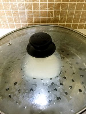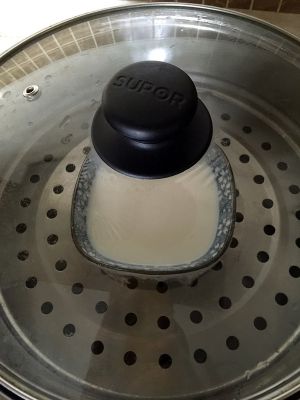 将盖好保鲜膜的牛奶放蒸锅,大火将水烧开,上汽后蒸10分钟,蒸好后取出牛奶晾凉。