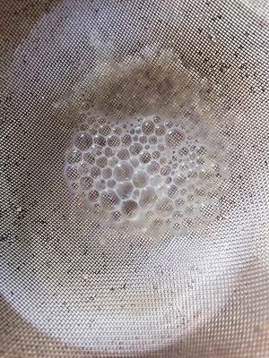 将搅拌均的牛奶过筛一遍。过筛是为了之后成品没有汽泡,吃起来口感更顺滑,当然也可不过筛。