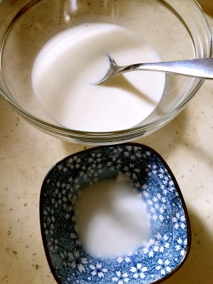 在牛奶中加入蛋白和白砂糖搅拌均匀(白砂糖可以根据个人口味增减)。
