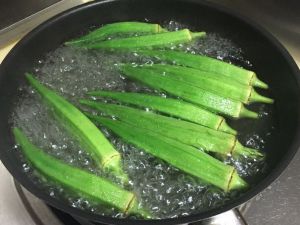 把清洗干净的秋葵放入锅中焯一下水。